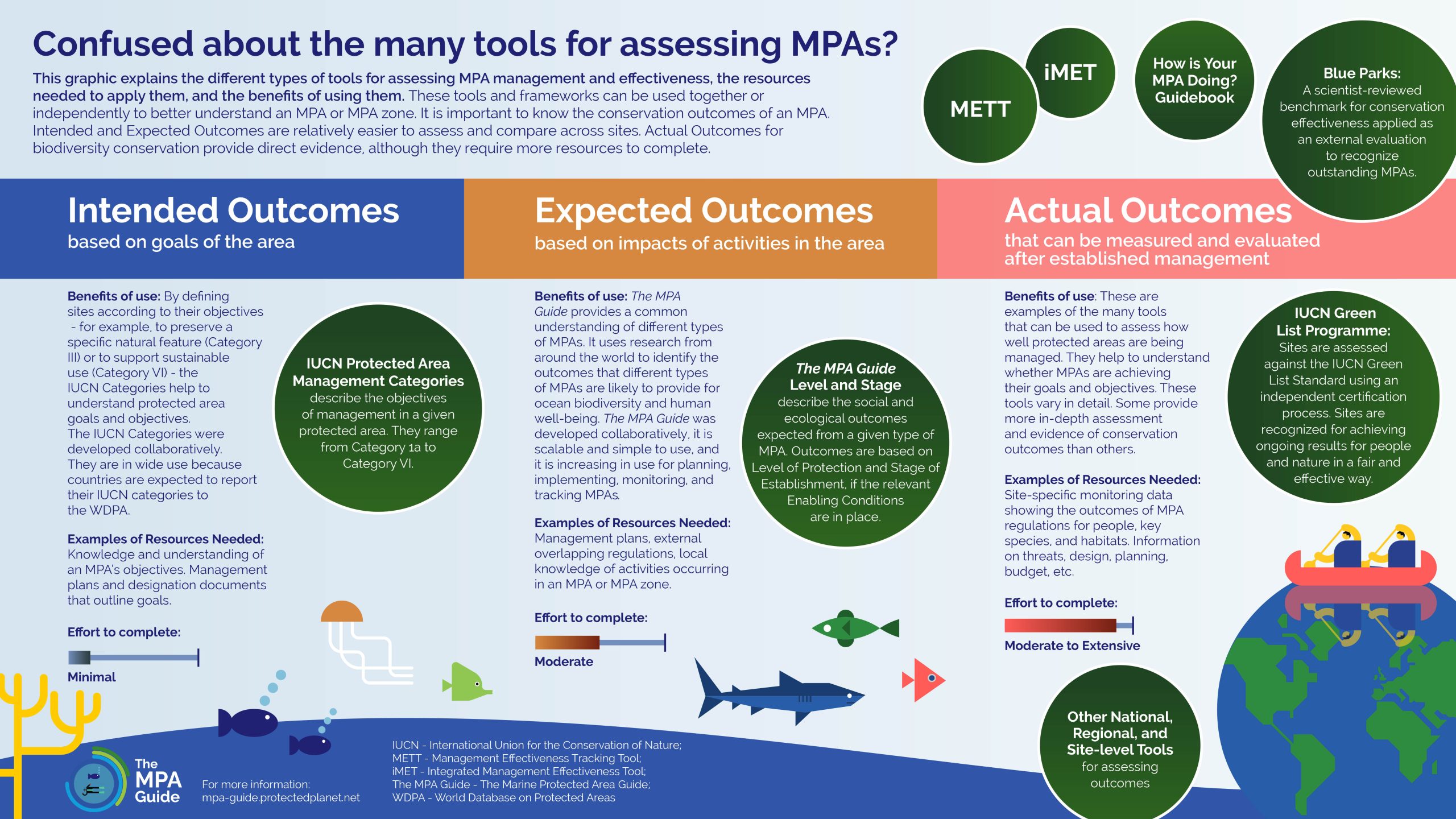 The MPA Guide is intended to fill a gap in existing MPA classification and assessment tools. In terms of global consistency with terminology and requiring a moderate level of effort to complete, The MPA Guide can help determine how likely MPAs are to deliver the desired conservation outcomes.